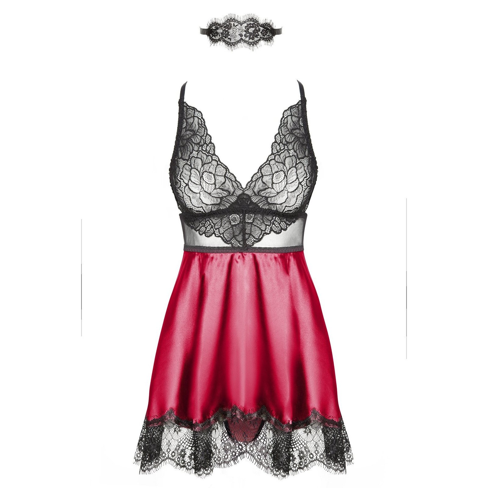 O conjunto inclui: Uma camisa de noite, uma tanga e uma máscara de renda a condizer.