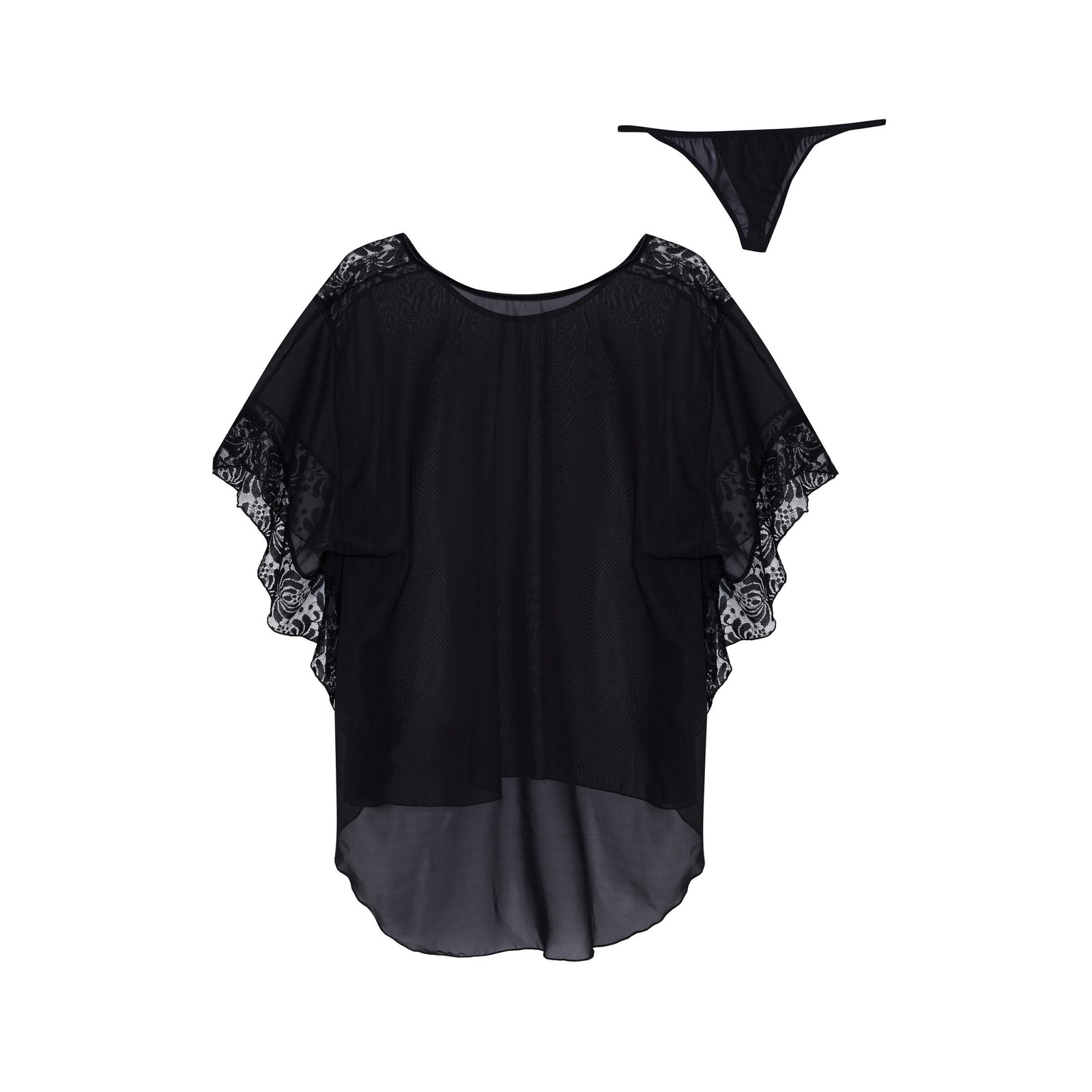 Camisa de noite extremamente tentadora feita de material transparente e delicado com renda decorativa nas mangas largas.