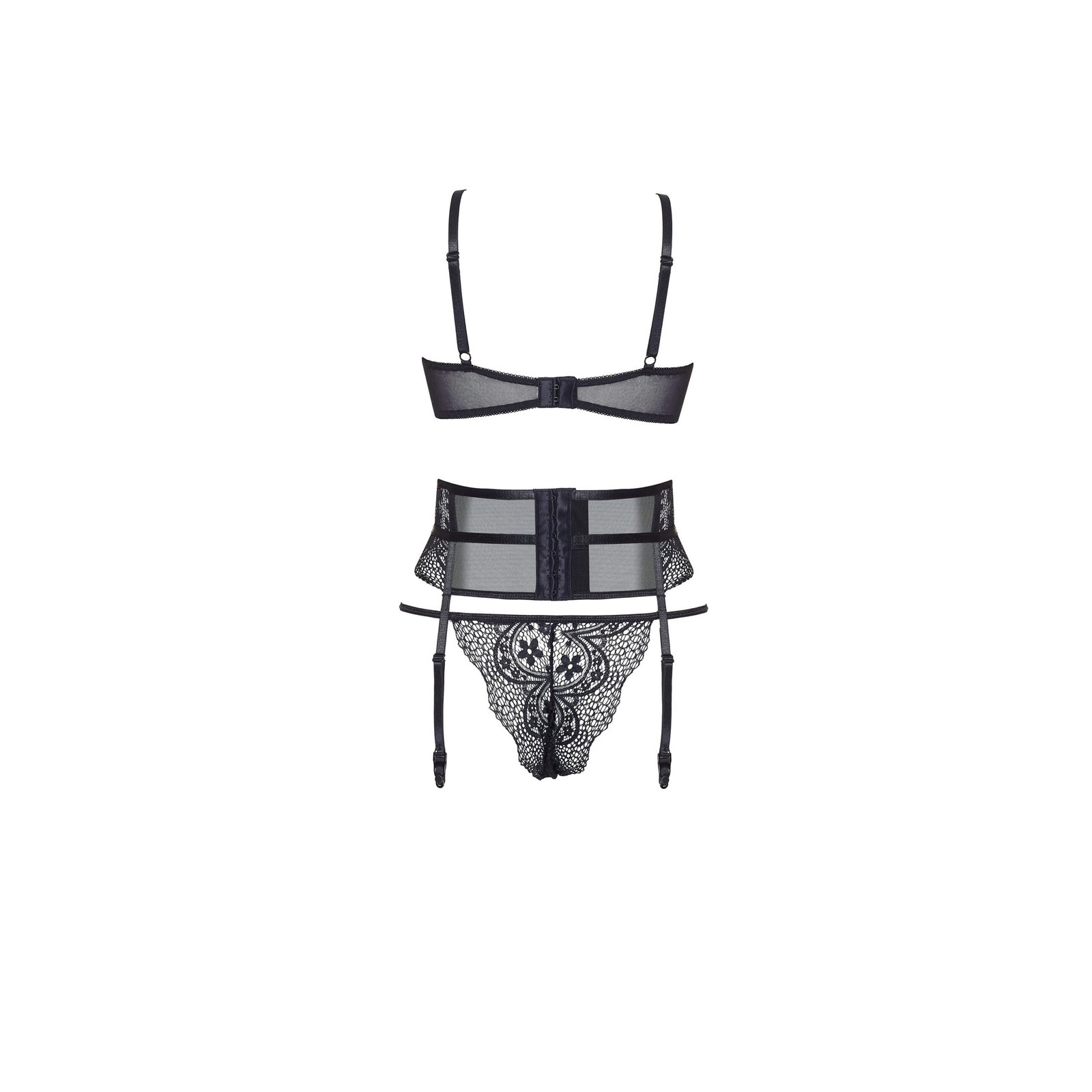 Conjunto de roupa interior preta de três peças clássico, mas ao mesmo tempo muito sexy. Sutiã aberto em renda e tule com aros. Um cinto de ligas vistoso preso com ganchos.