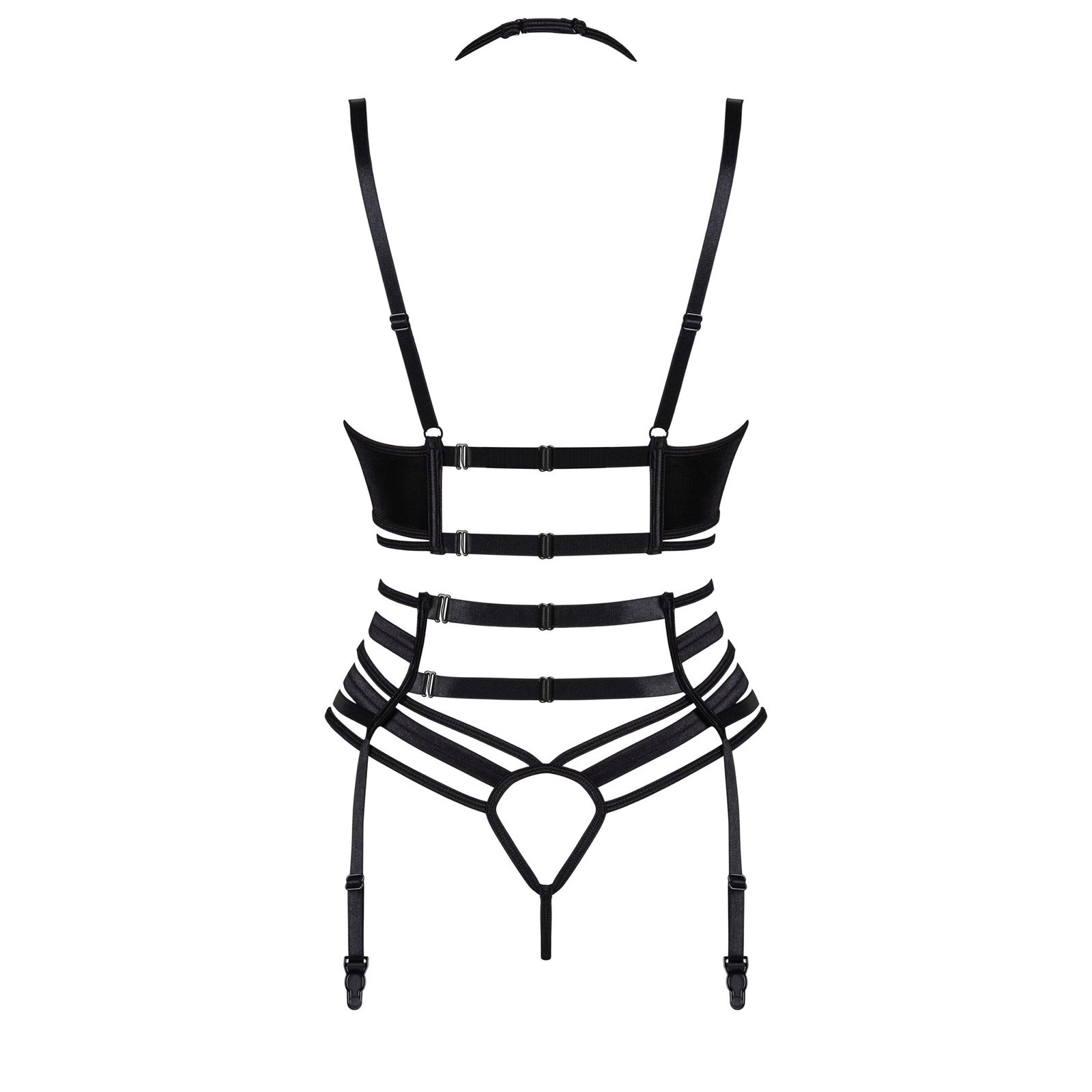 Conjunto extremamente luxuoso e sexy. É composto por um sutiã sofiticado de corte original, tanga e cinto de ligas. Este conjunto tem acabamentos em renda delicada que dão um toque sensual.