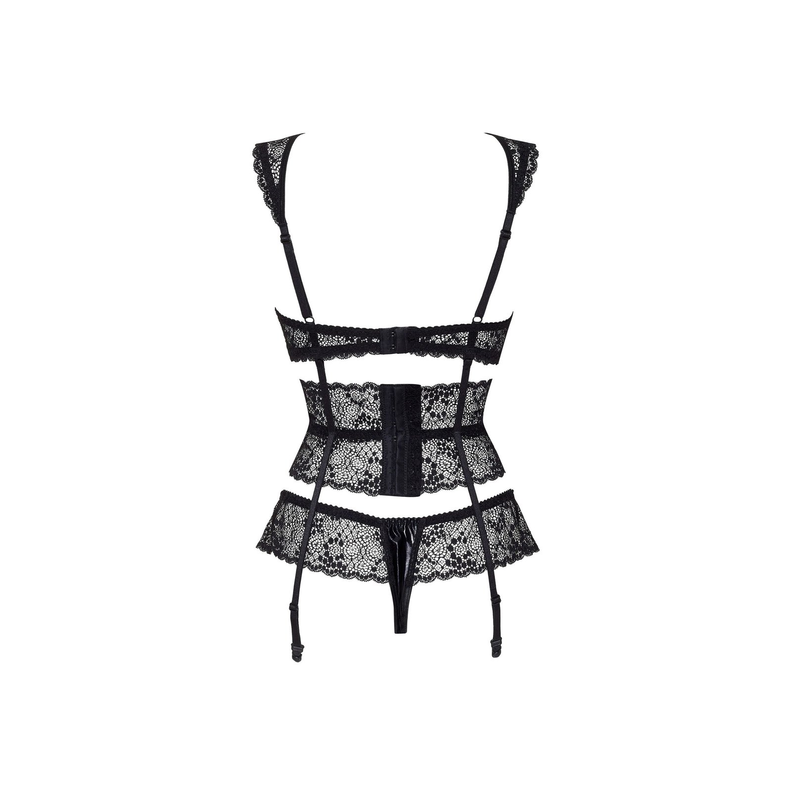 Design: Soutien com armação que proporciona apoio e acentua as suas curvas, garantindo que se sente confortável e sedutora. A renda luxuosa acrescenta um toque de sofisticação e sensualidade. Alças ajustáveis e ganchos nas costas. Cinto de ligas de cintura alta que realça a sua silhueta e acrescenta um charme vintage. Tanga a condizer que completa o conjunto com um visual sexy e arrojado.