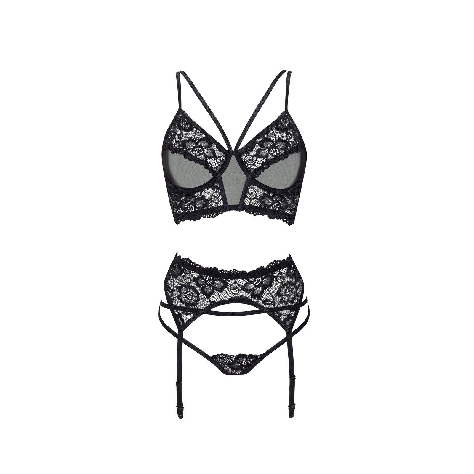 • Conjunto de três peças: sutiã, cinto de ligas e cuecas