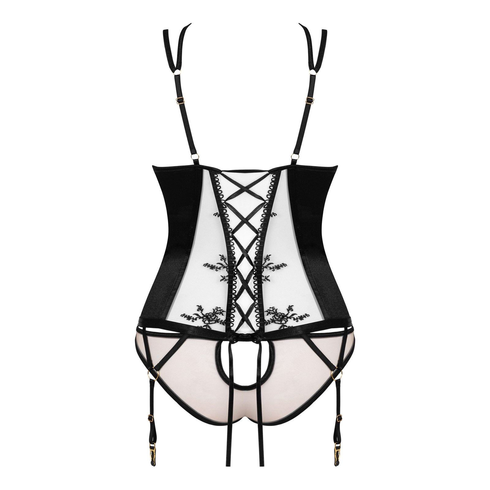 Descubra o sedutor corpete Gianna, que consiste num corpete lindamente decorado e uma tanga a condizer. Este conjunto sensual, feito de tule nude com um delicado padrão floral preto e cetim elástico luxuoso e brilhante, irá realçar a sua feminilidade e aumentar a sua confiança. É a escolha perfeita para noites românticas e como um presente especial para um ente querido.