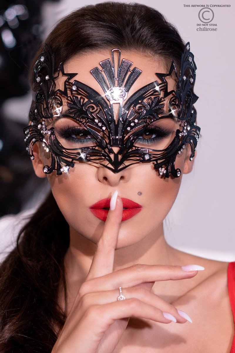 Máscara de filigrana em metal preto, anatómica e flexível, embelezada por cristais de strass. Ata por trás com fitas de cetim pretas.