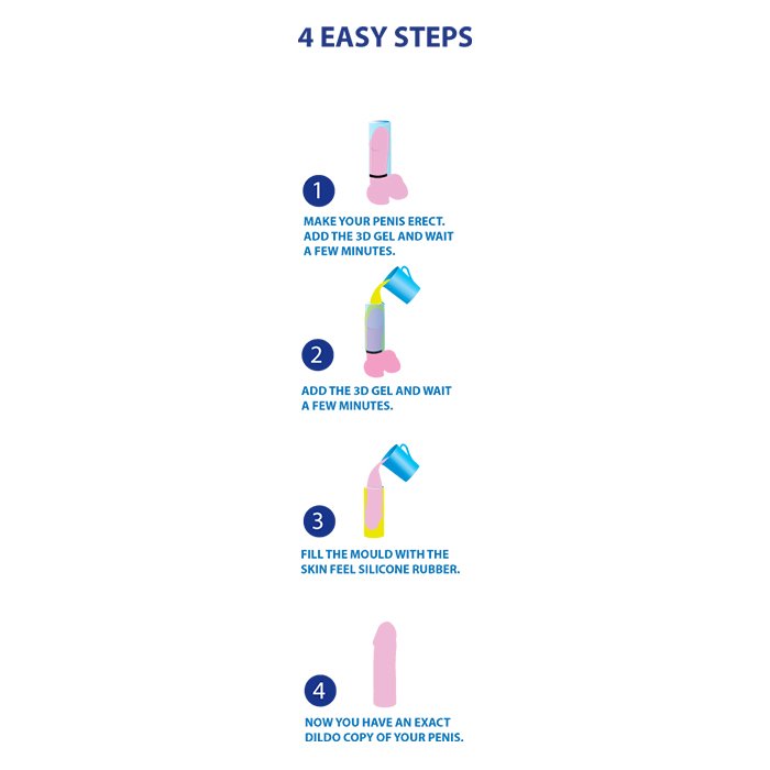 Siga as instruções detalhadas no interior da embalagem. Corte o plástico e coloque a manga numa das pontas para servir de vedante. Mantenha o pénis em ereção, de seguida coloque o anel na base do pénis. Misture o gel 3D com àgua. Coloque o gel sobre o pénis envolto na embalagem plástica. Aguarde cerca de 3 minutos e retire o pénis. Abra a embalagem de silicone e mexa, coloque no molde. Passados uns minutos retire e tem uma réplica perfeita do seu pénis.